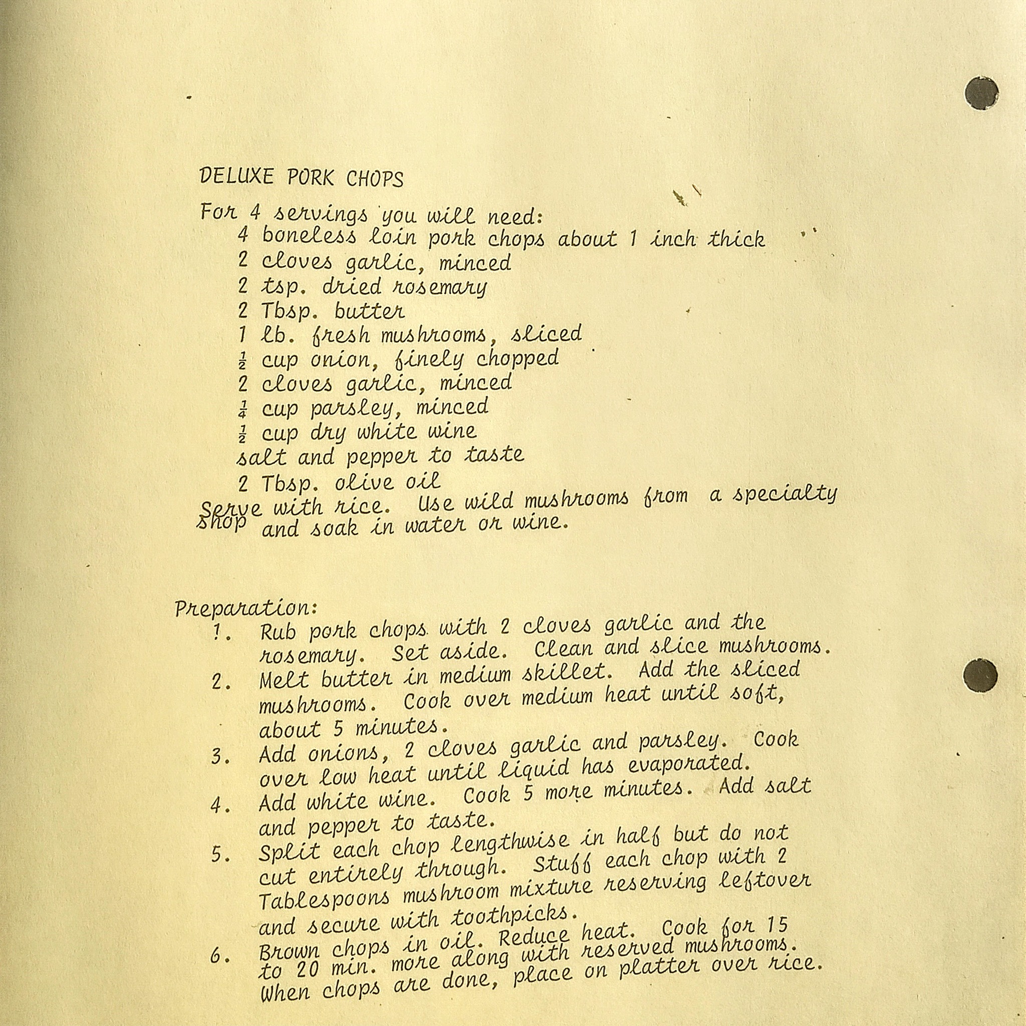 It was at another lunch when she gave me this collection of recipes as a birthday gift. It’s divided into no fewer than eight sections: appetizers, salad, fish, etc. I confess to not using this collection all that much, as it’s been the case with other cookbooks. More than once, though, I did use one of three pork chop recipes and it was good. One of the others is called “Rosalie’s pork chops,” an old-style recipe calling for blue cheese, thin ham, and Marsala wine. I could never part with this birthday gift. (On that note, Sue died in her sleep in the early morning after her birthday.)